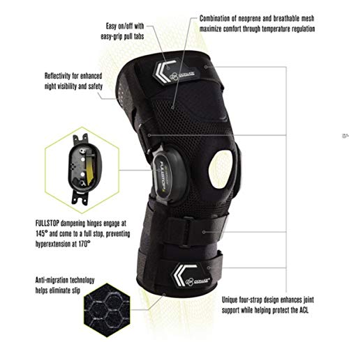 As part of our most stable line of sport performance bracing products, the DonJoy Performance BIONIC FULLSTOP ACL Knee Brace provides the ultimate in Anterior Cruciate Ligament (ACL) protection during recovery from injury, as well as prevention of future injury. FULLSTOP dampening hinges prevent hyperextension and help improve joint mechanics in both surgical and non-surgical knees. Through the dampening cycle of the hinge, muscle memory trains your body to keep both the braced and un-braced knees out of the “at risk” zone. Compression and thermal heat regulation technology in the brace keep you from overheating during exertion. Anti-migration technology prevents sleeve movement, even during your movement. The adjustable straps on the brace enable users to have greater customizability for a more secure, personal fit. The brace is also equipped with reflectivity for enhanced visibility in low-light conditions. The BIONIC FULLSTOP ACL Knee Brace is designed to treat and protect ACL and meniscus injuries, joint instabilities, moderate ligament and tendon sprains, hyperextension, and patella support. This brace is intended for use in sports similar to football, soccer, skiing/snowboarding, basketball, lacrosse, or volleyball. How to measure -1. Stand with your legs shoulder-width apart, legs slightly bent and leg muscles contracted. 2. Measure up six inches from the center of your knee with a tape measure.3. Measure the circumference of your thigh at the 6-inch mark. 4.Measure down six inches from the center of your knee with a tape measure. Then measure the circumference of your calf at the 6-inch mark