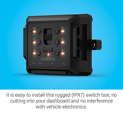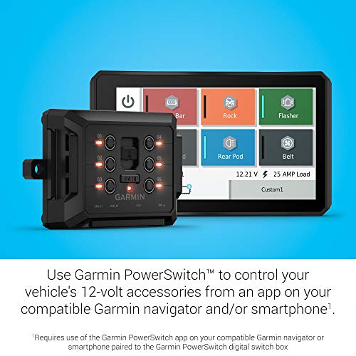 Use the Garmin PowerSwitch™ digital switch box to control your vehicle’s 12-volt accessories, including light bars, horns, air compressors, differential locks and more. The compact, weather-resistant (IPX7) box is easy to install with no cutting into your dash to mount switches and no interference with vehicle electronics. Wirelessly connect with your compatible Garmin navigator or smartphone downloaded with the Garmin PowerSwitch app and paired with your Garmin PowerSwitch digital switch box for simple control of accessory outputs right from your touchscreen device. Create custom virtual switch panels to activate groups of channels and control dimming and flashing. When the device is paired with a Tread™ powersport navigator (Sold separately), you can create and use smart switches that automatically activate, based on vehicle speed and time of day.