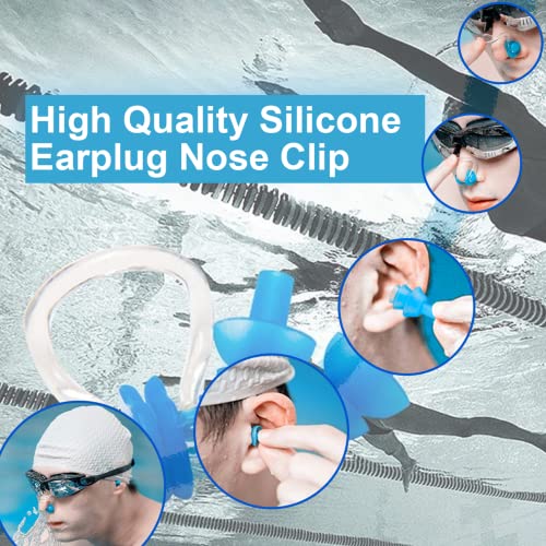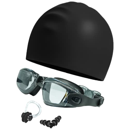 ITEM CONTAINS:Swimming goggles cap ear nose plugs for women and men with nose cover. Contains: swimming goggles*1, swimming cap*1, nose clip*1, a pair of earplugs, swimming goggles case*1.