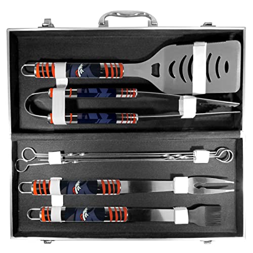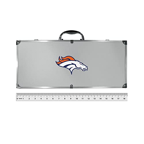 This is the ultimate Denver Broncos tailgate accessory! the high quality, 420 grade stainless steel tools are durable and well-made enough to make even the pickiest grill master smile. This complete grill accessory kit includes; 4 skewers, spatula with bottle opener and serrated knife edge, Basting brush, tongs and a fork. The 18 inch metal carrying case is perfect for great outdoor use making grilling an ease while camping, tailgating or while having a game day party on your patio. The tools are 17 inches long and feature vivid team graphics. The metal case features a large team emblem with exceptional detail. This high-end men’s gift is sure to be a hit as a present on father’s day or Christmas.