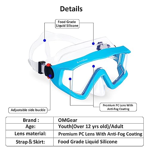 【Easy-adjustable Side Buckles】OMGear scuba mask fits for different users because the side buckle is easy-adjustable .So users can adjust the snorkeling goggles fit for users’ face.The key point of avoiding the leakage is to tighten the mask and you can feel that the silicone skirt is fully absorbed on your face.With adjustable buckles,OMGear diving goggles fits for adults and kids over 12 years old.