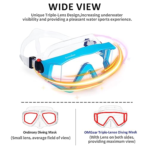 【Premium PC Triple-Lens with Anti-fog Coating】OMGear three lens diving mask is made by premium Polycarbonate with anti-fog coating,providing a panoramic field of vision and clear view. This Swim goggles with